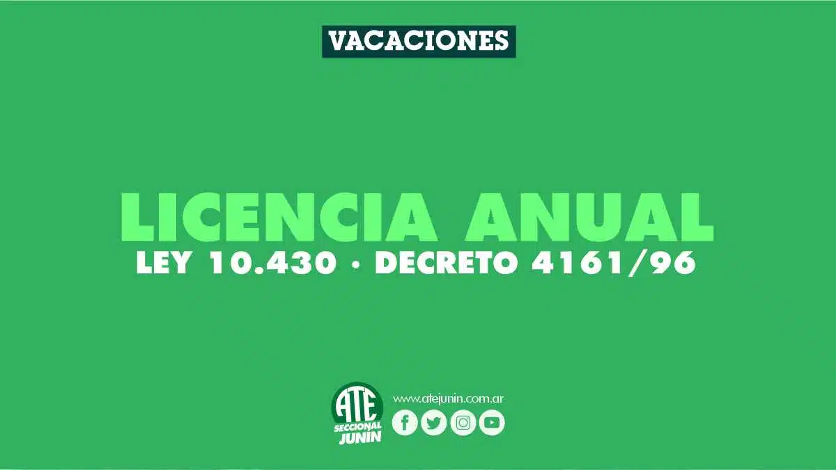 ATE Junín te acerca estos artículos de importancia a la hora de hacer uso de la Licencia Anual (Vacaciones). Debajo adjuntamos le Ley 10.430 y el Decreto 4161/96 que mencionamos en este artículo.