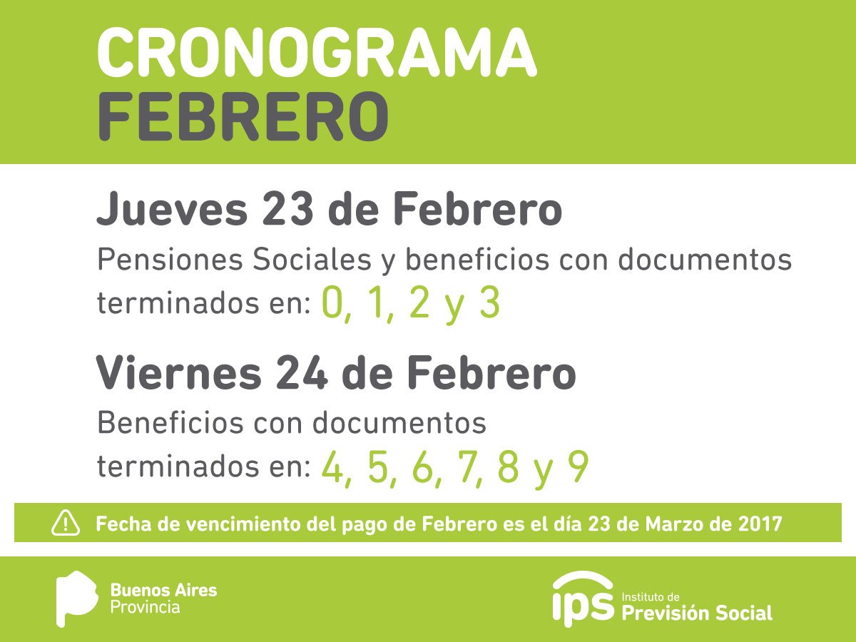 El Instituto de Previsión Social (IPS), informa que los jubilados y pensionados de la Provincia de Buenos Aires percibirán los haberes del mes de febrero entre el jueves 23 y viernes 24, según cronograma que se detalla a continuación: