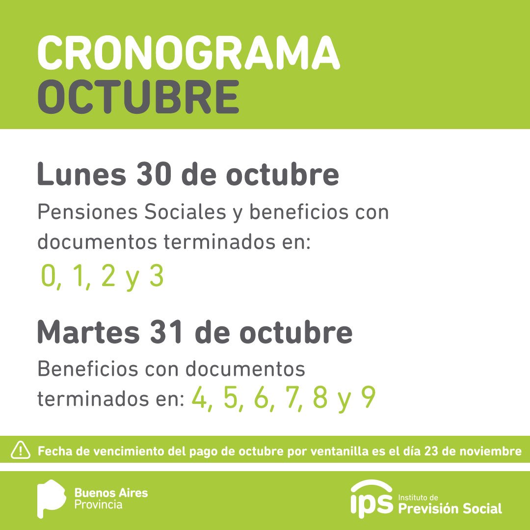 El Instituto de Previsión Social (IPS), informa que los jubilados y pensionados de la Provincia de Buenos Aires percibirán los haberes del mes de octubre entre el 30 y 31 de octubre, según cronograma que se detalla a continuación: