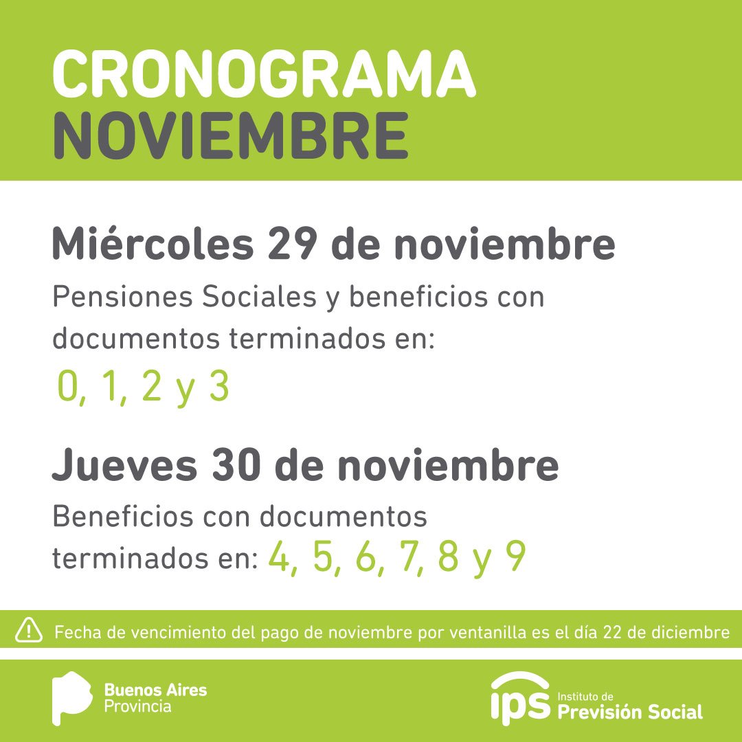 El Instituto de Previsión Social (IPS), informa que los jubilados y pensionados de la Provincia de Buenos Aires percibirán los haberes del mes de noviembre entre el 29 y 30 de noviembre, según cronograma que se detalla a continuación: