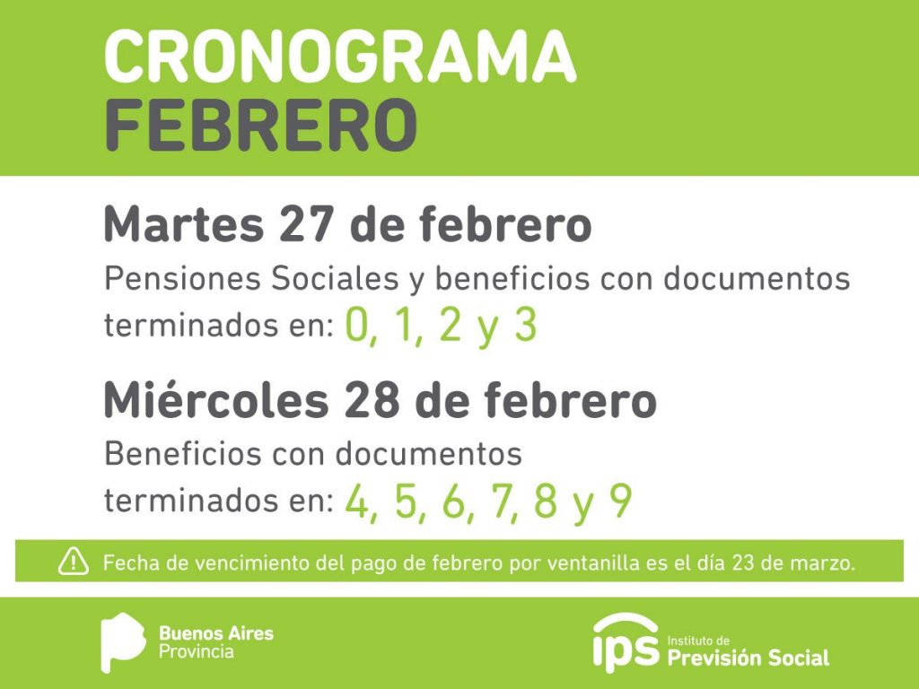 El Instituto de Previsión Social (IPS), informa que los jubilados y pensionados de la Provincia de Buenos Aires percibirán los haberes del mes de febrero de 2018 entre el 27 y 28 de febrero, según cronograma que se detalla a continuación:
