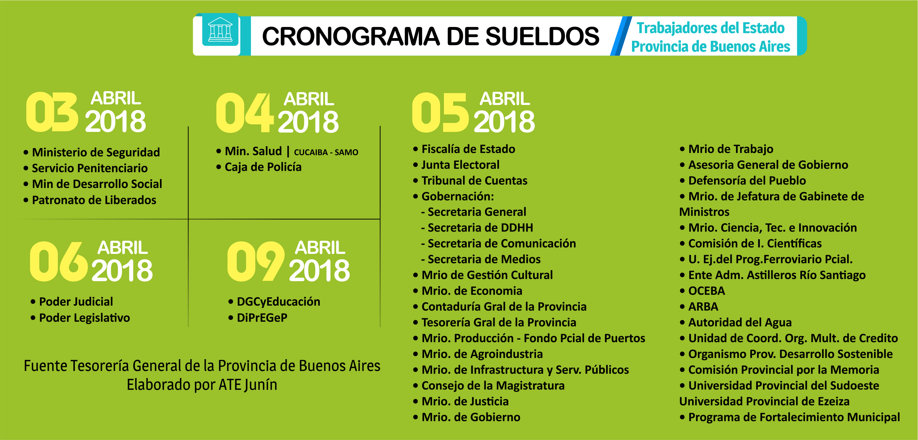 La tesorería del gobierno de la provincia de Buenos Aires, informa el siguiente cronograma de pago de pago del mes de marzo de 2018.