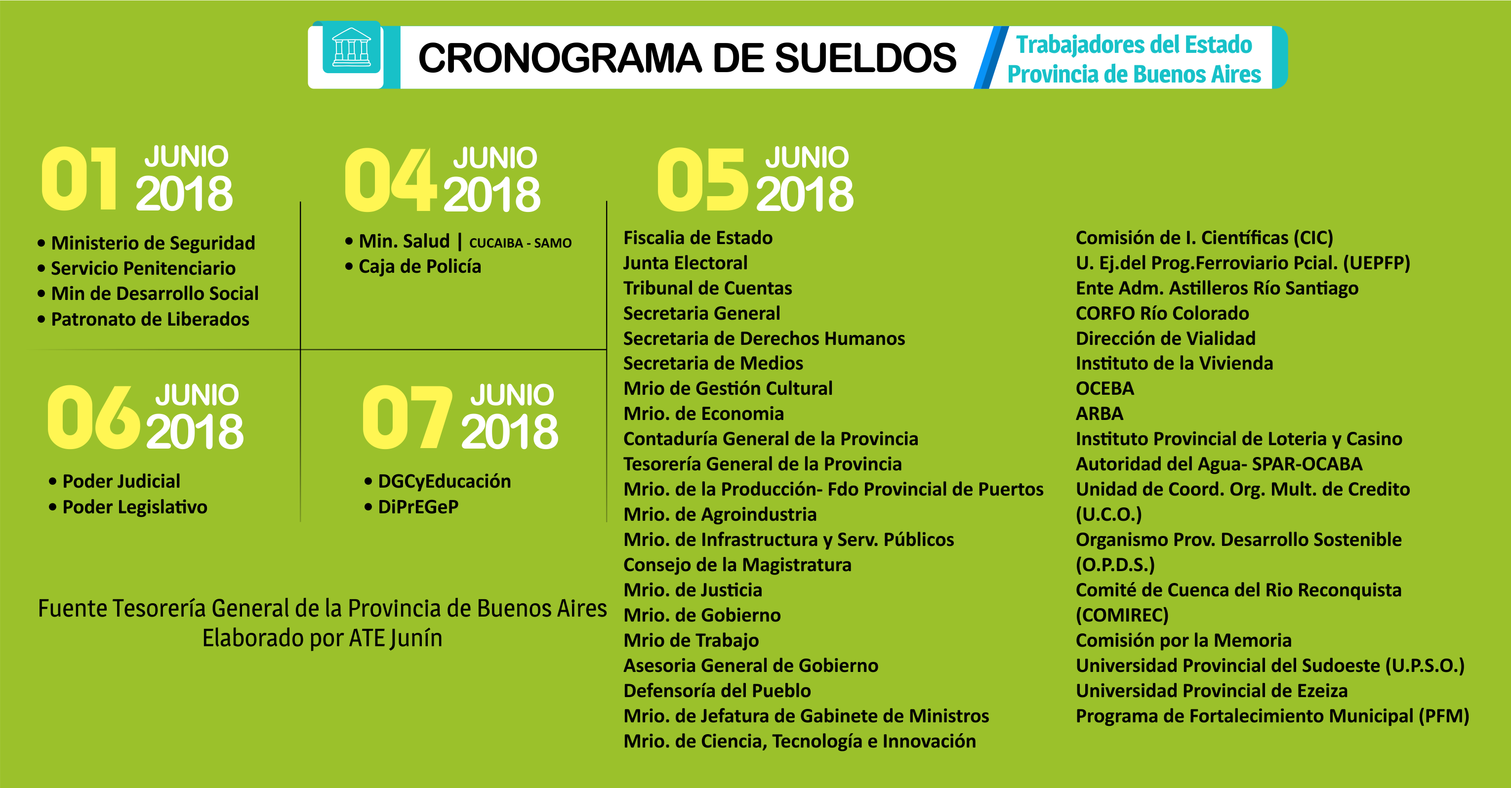 La tesorería del gobierno de la provincia de Buenos Aires, informa el siguiente cronograma de pago del mes de mayo de 2018.