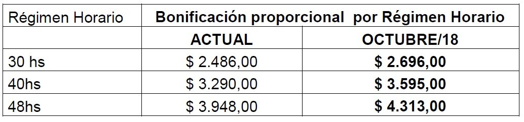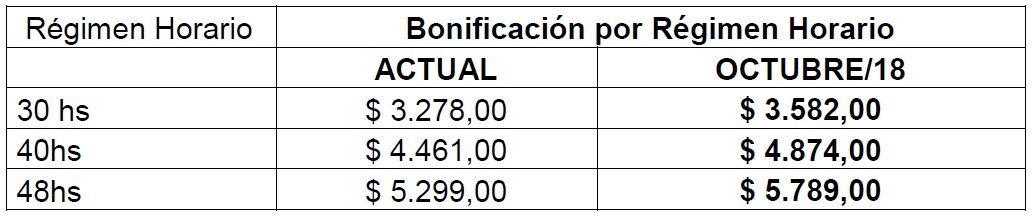 Se incrementa desde el 1 de octubre de 2018 la bonificación remunerativa no bonificable proporcional por régimen horario en los siguientes valores en pesos que se indican a continuación: