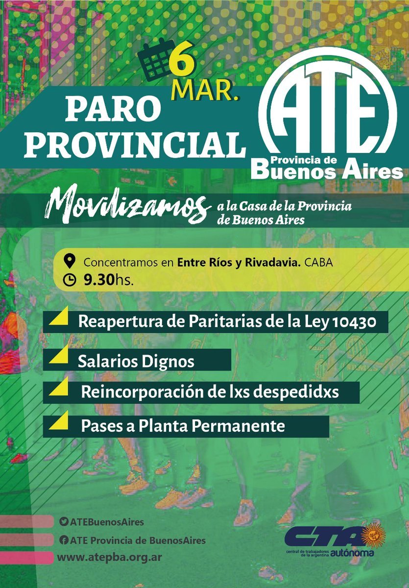 ATE para y moviliza, el día miércoles 6 de marzo, en reclamo de la reapertura de la paritaria correspondiente a la Ley Nº 10.430, exigiendo el pase a planta de trabajadores en situación de precariedad y la urgente inversión en infraestructura.