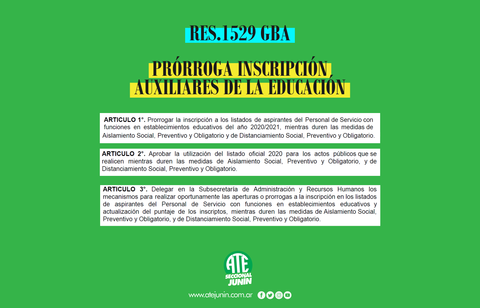 Mediante la Resolución 1529 del Gobierno de la Provincia de Buenos Aires prorroga la inscripción a los listados de aspirantes del Personal de Servicio con funciones en establecimientos educativos (auxiliares de la educación).
