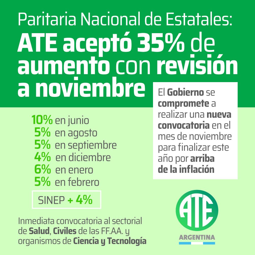 La recomposición salarial será del 35% en 6 cuotas: 10% en junio, 5% en agosto, 5% en septiembre, 4% en diciembre, 6% en enero de 2022 y 5% en febrero del mismo año. Además, por reiterados pedidos de ATE, se incluyó una cláusula de revisión para el mes de noviembre.