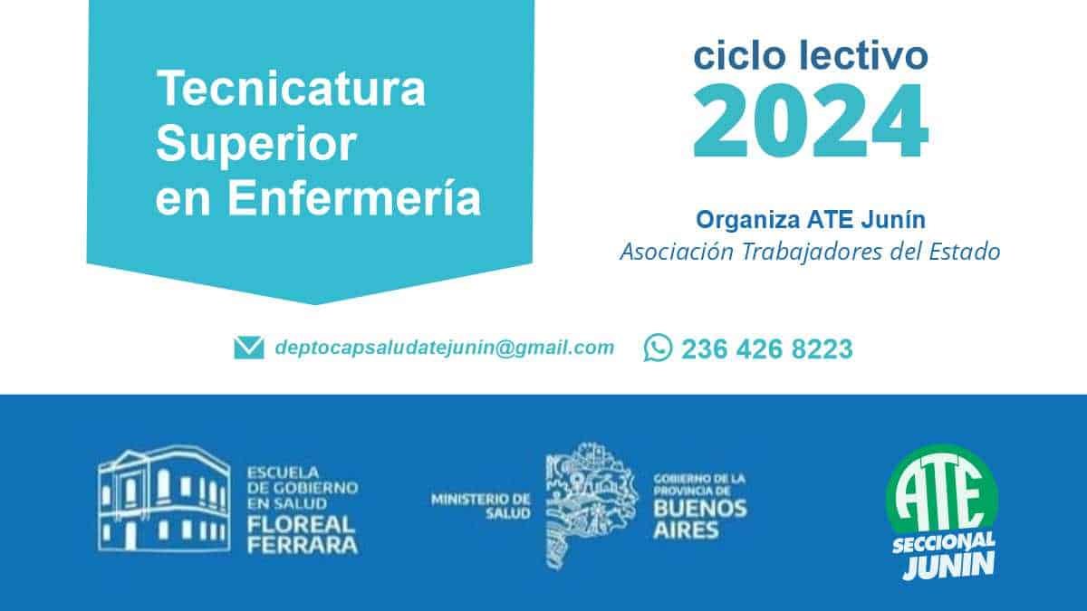 Informamos que se encuentra abierta la inscripción a la Tecnicatura Superior en Enfermería del Ciclo Lectivo 2024, de la Escuela de Gobierno en Salud “Floreal Ferrara” del Ministerio de Salud de la provincia de Buenos Aires en conjunto con la Asociación Trabajadores del Estado, Seccional Junín.