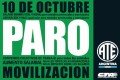 El Consejo Directivo Provincial entrerriano, acatando lo resuelto por el Confederal de ATE del 9 de septiembre, convoca al paro del 10 de octubre a todos los trabajadores estatales nacionales, provinciales y municipales en reclamo de salarios, condiciones laborales, igual valor en las asignaciones familiares para los estatales provinciales y municipales y sin topes, contra el impuesto a los salarios, y por convenio colectivo para todos los estatales.