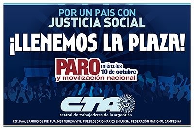 Convocamos a un Paro Nacional con Movilización el 10 de octubre en reclamo de una justa Distribución de la Riqueza; Soberanía sobre nuestros Bienes Naturales; Democracia Participativa; Reforma Impositiva para que paguen más los que más tienen; Gravamen a las Rentas Extraordinarias; Nueva Ley de Entidades Financieras; no pago de la Deuda Externa ilegítima e ilegal; Comercio Exterior soberano con control popular; defensa y promoción de la Educación y Salud públicas. No consentimos políticas devaluacionistas y propiciamos el debate de otro Modelo Productivo que interpele a este régimen extractivista, agroexportador y concentrador, que favorece el monocultivo sojero, o sea, expoliador, colonial y no sustentable que conspira contra el bienestar de nuestro pueblo.