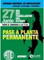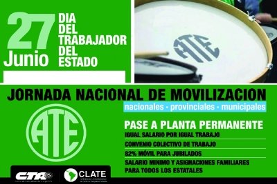 La Asociación Trabajadores del Estado convoca a una Jornada Nacional de Movilización en todas las ciudades del país para el próximo 27 de Junio, Día del Trabajador Estatal. En la ciudad de Buenos Aires, ATE se concentrará a las 13 hs. frente al Congreso de la Nación.