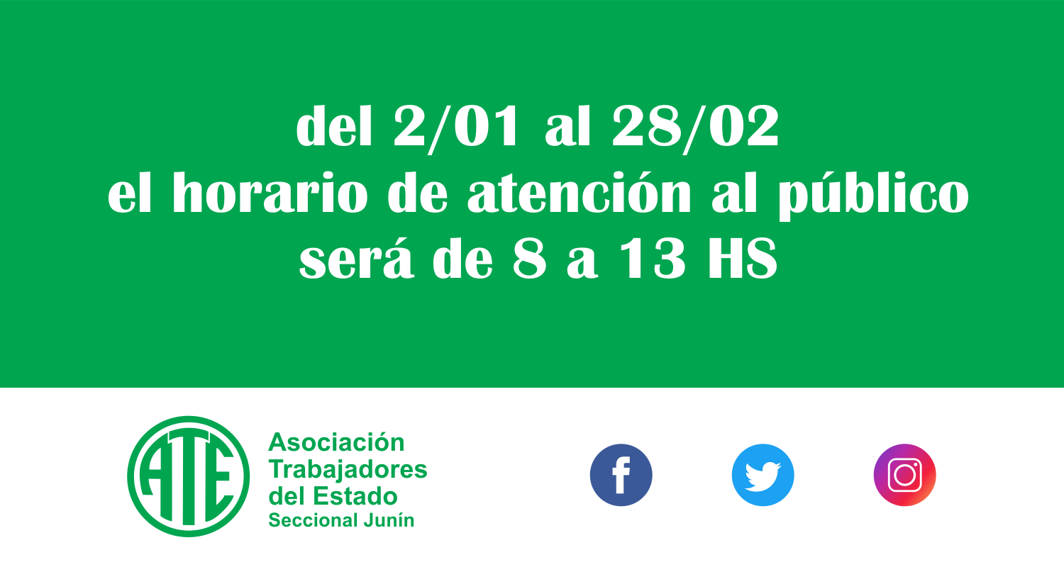 La seccional de ATE Junín informa a todos sus afiliados y comunidad en general, que desde el 2 de enero y hasta…